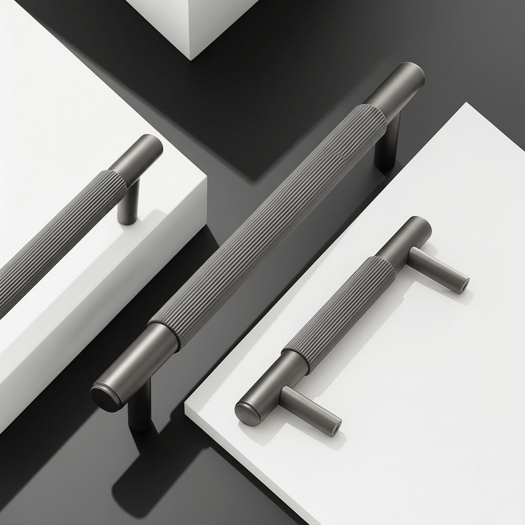 Gråt greb i massiv messing med rillet overflade. Et moderne greb og en af vores absolut bestsellere i butikken. Velegnet til køkkenlåger samt til badeværelses kommoder og andre møbler. Dets solide vægt kombineret med de rillede detaljer går ikke ubemærket hen. Et premium greb til dem, der værdsætter detaljer og kvalitet.