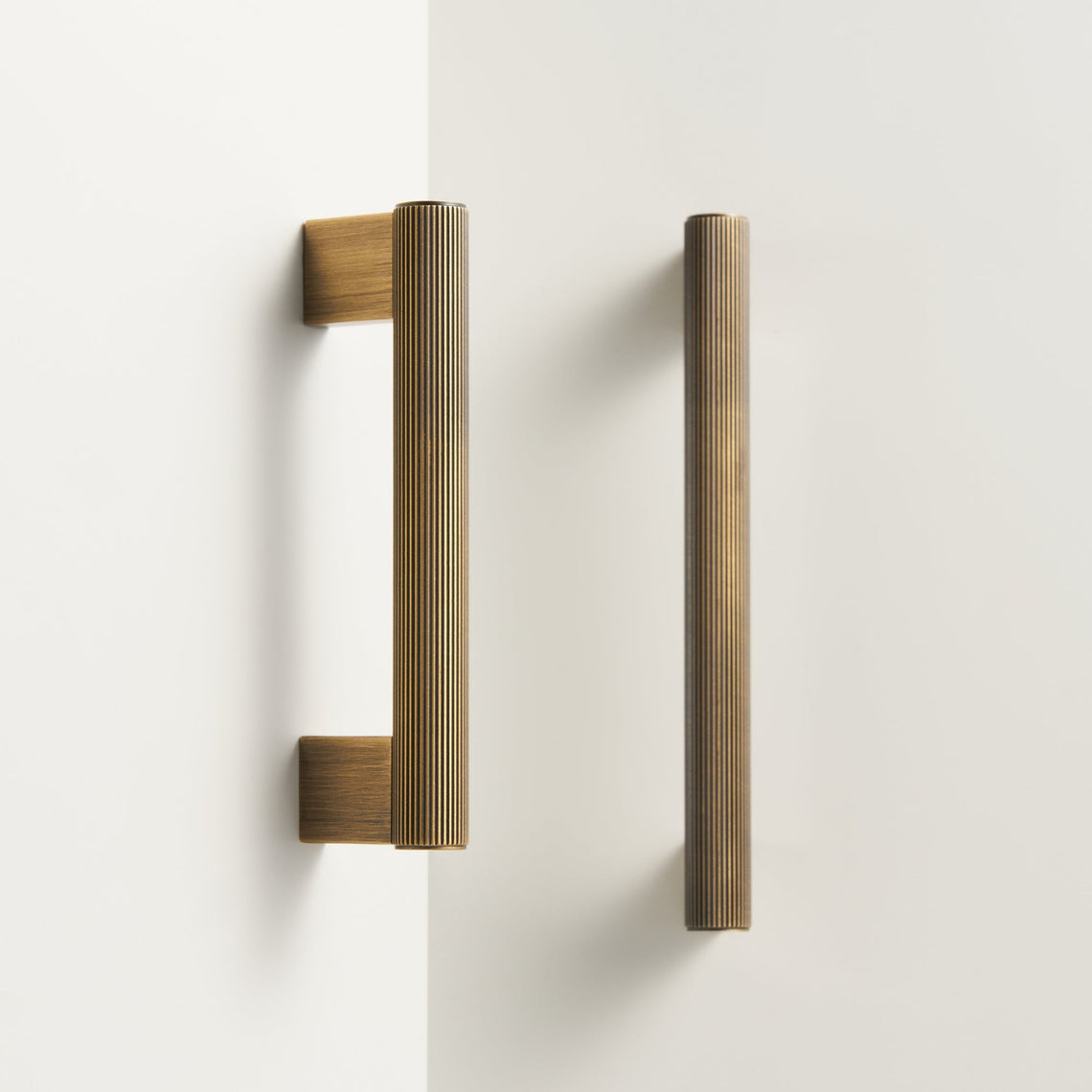 Giv dine møbler eller køkkenlåger et elegant og moderne præg med disse greb i solid messing med antik finish. Den rillede overflade giver både et solidt greb og tilføjer ekstra karakter til rummet. Håndtagene er perfekte for dig, der søger et tidløst design med et eksklusivt touch.
