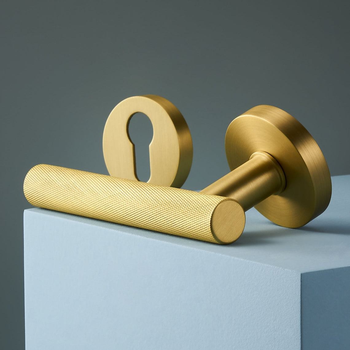 Verleihen Sie Ihren Innentüren mit diesem exklusiven Türgriff aus massivem Messing neuen Glanz. Die gerändelte Griffoberfläche verleiht dem Griff Stil und Charakter und trägt gleichzeitig zu einem modernen und eleganten Ambiente in Ihrem Zuhause bei. Kombinieren Sie ihn mit passenden Beschlägen oder Knöpfen aus unseren anderen Serien, um ein perfektes Gesamtbild zu schaffen.