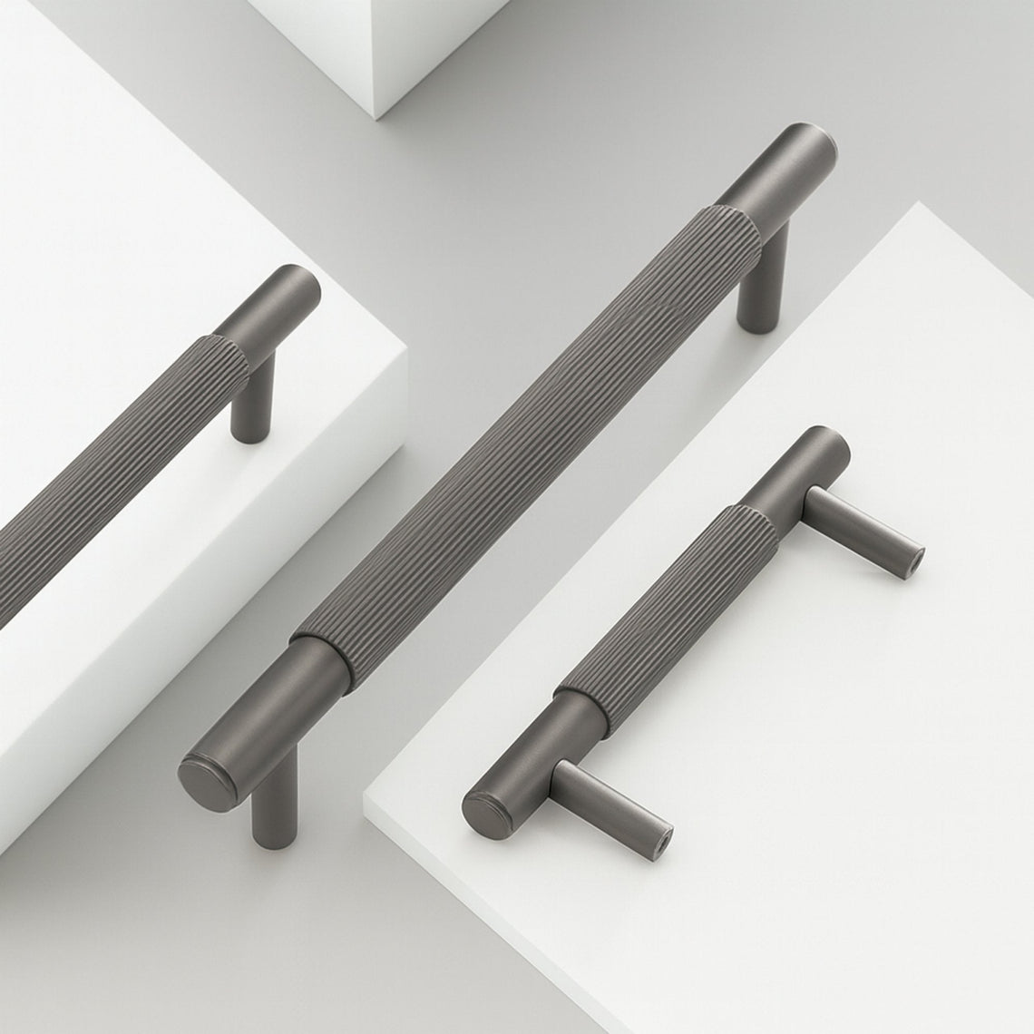 Gray cabinet handle made of solid brass with ribbed surface. A modern cabinet handle and one of our absolute best sellers in the store. Suitable for kitchen cabinet doors as well as for bathroom vanities or furniture. Its solid weight combined with the ribbed details does not go unnoticed. A premium cabinet handle for those who value detail and quality.